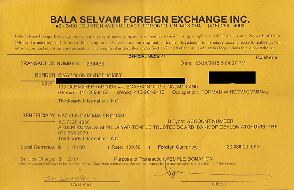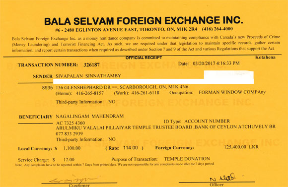 March 29, 2019 2015 இலிருந்து ஐயர் சம்பளத்திற்காக ஒவ்வொரு வருடமும் அனுப்பப்படும் தொகை இவ்வருடமும் அனுப்பி வைக்கப் பட்டுள்ளது. கனடாவில் பணம் கொடுத்துதவியவர்கள் விபரமும் பணம் அனுப்பிய பற்றுச்சீட்டும் இணைக்கப்பட்டுள்ளது. பணம் கொடுத்துதவிய அன்பர்கள் அனைவருக்கும் ஒன்றியச் செயற்குழு தனது மனம் கனிந்த நன்றியைச் தெரிவித்துக் கொள்கின்றது.