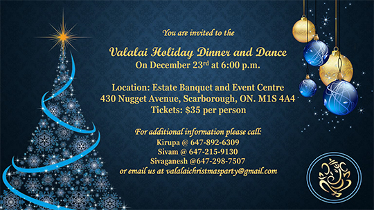 | வளலாய் விடுமுறைக்கால இரவு விருந்து மற்றும் நடன நிகழ்வு டிசம்பர் 23 2017, மாலை 6 மணிக்கு, ESTATE BANQUET AND EVENT CENTRE, 430, NUGGET AVENUE, SCARBOROUGH, ON. M1S 4A4 என்னும் முகவரியில் இடம்பெறவுள்ளது. இந்நிகழ்வின் போது ஐந்து மணித்துளி களுக்கு மேற்படாதவாறு கலை நிகழ்ச்சிகள் வழங்க விரும்பு வோர்கள் தங்கள் பிள்ளைகளின் பெயர் வயது நிகழ்சியின் தன்மை ஆகிய விபரங்களை விழாக்குழுவினரிடம் முன்பதிவு செய்யுமாறு தயவாய் கேட்டுக் கொள்கின்றோம். |