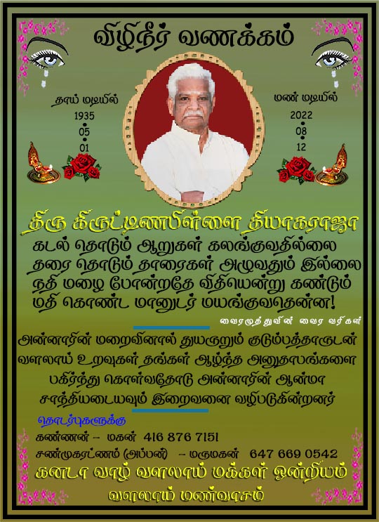வறணன் அச்சுவேலியை பிறப்பிடமாகவும் கனடாவை வதிவிட மாகவும் கொண்டிருந்த கிருட்டிணபிள்ளை தியாகராசா அவர்கள் ஆகஸ்ட் 12 2022 வெள்ளிக்கிழமை இறைவனடிசேர்ந்தார்.