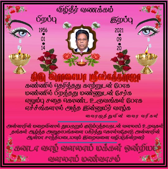 யாழ். வளலாயைப் பிறப்பிடமாகவும், பிரித்தானியா லண்டனை வசிப்பிடமாகவும் கொண்ட இராசையா ஸ்ரீஸ்கந்தராஜா அவர்கள் 20-09-2021 திங்கட்கிழமை அன்று இறைவனடி சேர்ந்தார்.