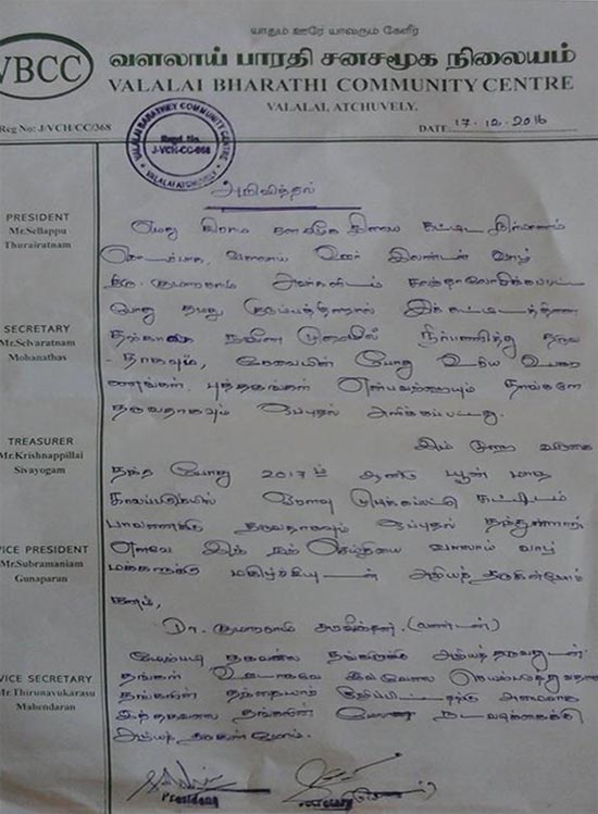 மேலும் வளலாய் கிராம நன்மை கருதி ஆரம்ப கட்ட நடவடிக்கையாக சனசமுக நிலையக் கட்டடம் அபை்பதற்கு வளலாய் வாழ் மக்களதும் புலம்பெயர்ந்து வாழும் வளலாய் உறவுகளினதும் மேலான பேராதரவினை வேண்டி நிற்கின்றோம் |