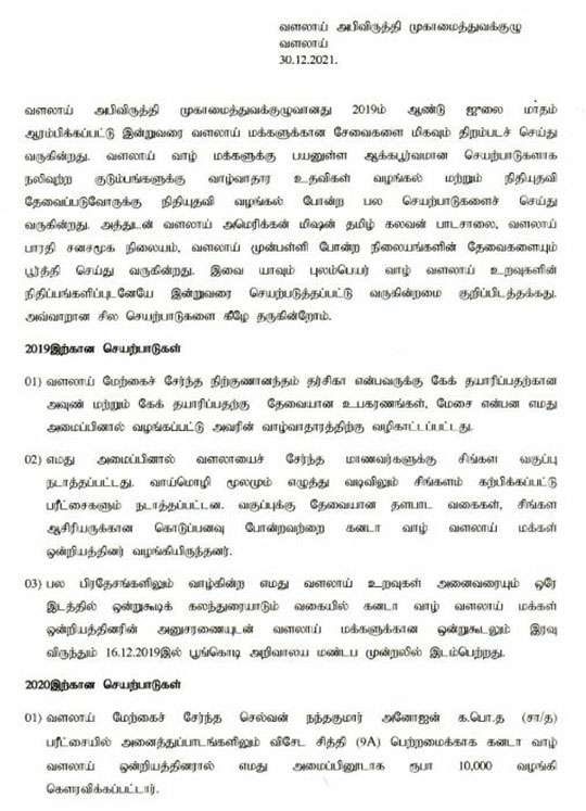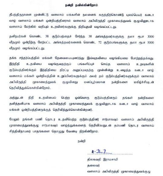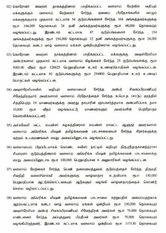 | கனடா வாழ் வளலாய் ஒன்றிய செயற்குழுவுக்கு கிடைத்த திருமதி கலைச்செல்வி சிவநிதி (குட்டி) யின் கடிதம் தொடர்பில் பொருளாளரின் கவலை கலந்த உரையாடலை செவிவழி கேள்வி யுற்ற வளலாய் உறவுகளில் பின்வரும் ஒன்ராரியோ வாழ் உறவுகளான அமரர்கள் விசயம் மற்றும் மாயம் வைத்தியர் குடும்பத்தார் மற்றும் சின்னத்தம்பி சிவசுப்ரமணியம் (கண் ணன்), தயா சிவலிங்கம், தபோ டிலோஜன் ஆகியோரும் மொன்றியோல் வாழ் வளலாய் உறவுகள் ஜெயந்தி, சாந்தி, சுபாஷினி, கஜரூபன், காஞ்சனா, கிளி மற்றும் ராசன் ஆகியோரும் தாமாகவே முன்வந்து உதவியுள்ளனர். கோரக் கொரனாவின் பரவலில் இருந்து மக்களைக் காக்க அரசு அறிவித்த உள்ளிருப்புகளாலும் சமூக இடைவெளி பேணும் நடவடிக்கைகளாலும் 2020 2021 களில் கனடா ஒன்றிய செயல்பாடுகளும் முடங்கியுள்ளன. இருப்பினும் ஏற்கனவே வெவ்வேறு சந்தர்பங்களில் (உ+ம்-தைப்பொங்கல் உதவு தொகை, உள்வீதி கூரை விரிவாக்கம், ஐயர் சம்பளம், நூலக பொறுப்பாளர சம்பளம், வளலாய் முன் பள்ளி ஆசிரியர் சம்பளம் போன்ற இன்னும் பல) உதவியவர்களிடம் இம்முறை உதவி நாடவில்லை. தவிர கொரானாவின் கோரப்பிடியில் இருந்து முற்றாக விடுபட்டு இயல்பு வாழ்க்கை திரும்பும் வரை ஒன்றியம் எதிர்கொள்ளும் தேவைகளுக்கு விடுபட்ட மற்றவர் களிடமும் உதவி நாடுவோம் | |